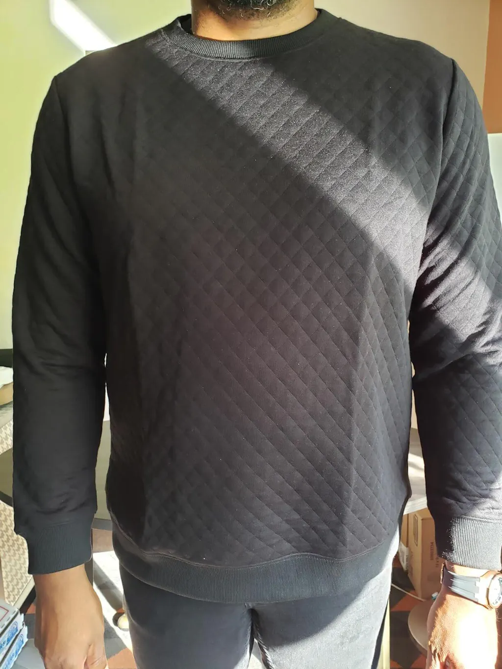 - Design: Classic crewneck with diamond-knit texture